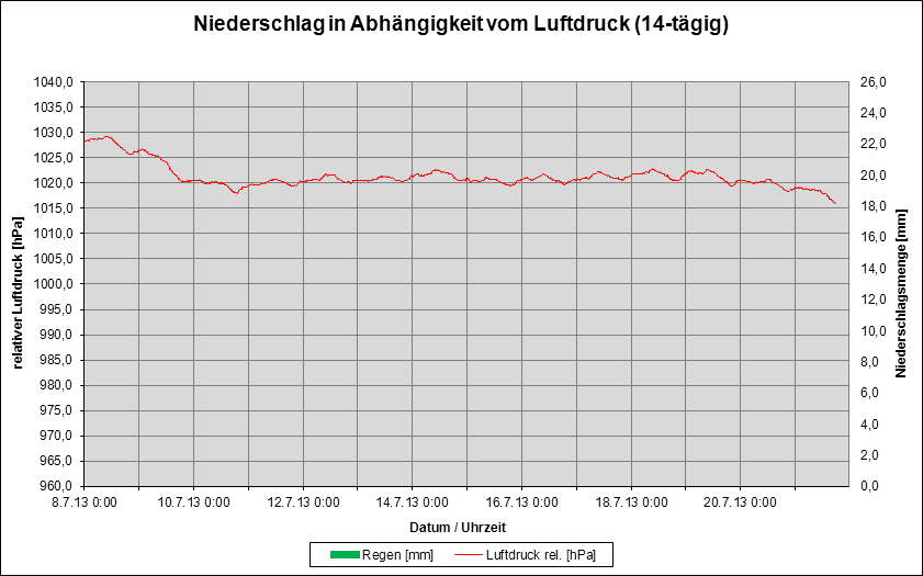 Grafik 2 zeigt den Verlauf des Luftdrucks bei gleichzeitiger Erfassung der Niederschlagsmengen für die letzten 14 Tage (Stand: 21.07.13 -18°°).