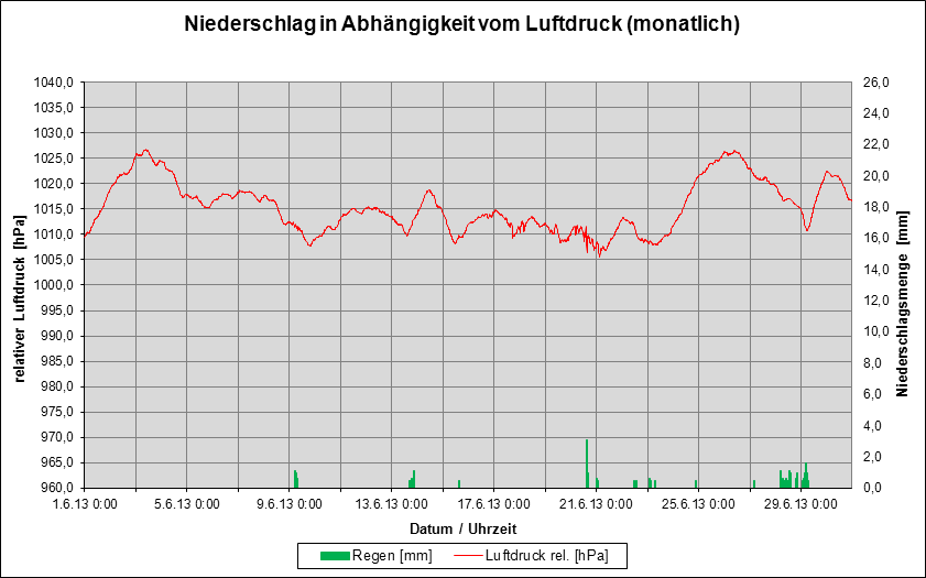 Grafik 4 zeigt den Verlauf des Luftdrucks bei gleichzeitiger Erfassung der Niederschlagsmengen für Juni 2013.