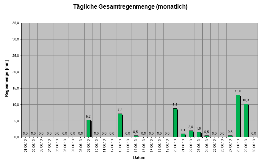 Grafik 5 zeigt die Niederschlagsmengen pro Tag für den Monat Juni 2013.