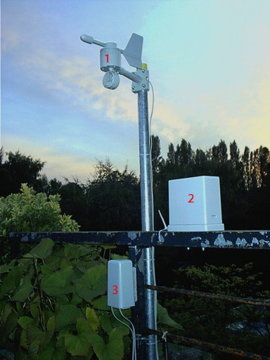 Im Foto sieht man Windmesser (1), Regenmesser (2) und Zentraleinheit (3) zur Erfassung von Luftfeuchtigkeit und Temperatur.